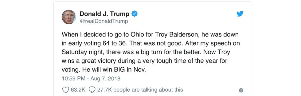 Trump's tweet late Tuesday night, exulting in "a great victory" for Balderson and claiming it as a validation of his own political superpowers? Like so many of the president's fulminations, it's delusional. It's self-infatuated hooey.