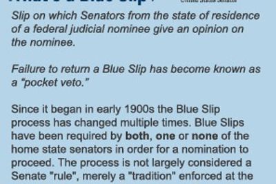 When Democrats controlled the Senate, blue slips were considered so sacred then even Democratic leader Harry Reid couldn't get a judge confirmed from his home state of Nevada when Nevada's Republican Senator Dean Heller wouldn't return his blue slip. Now, McConnell says that the blue slip will be treated as "notification" of how a senator will vote, "and not an opportunity to blackball."