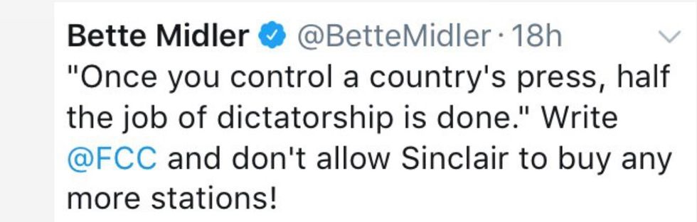 So yes, follow Bette's advice. Write to the FCC -- Federal Communications Commission/445 12th Street, SW, Washington, DC 20554 --or call them -888-863-2244 -- or tweet to them @FCC. Object to the Sinclair-Tribune merger. Repeat Bette's wise words, "Once you control a country's press, half the job of dictatorship is done."