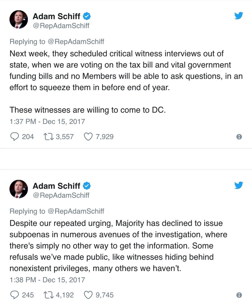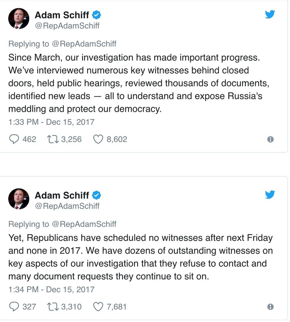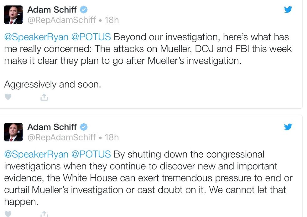 In his tweets, Schiff warned the public that attacks on the Justice Department by Republicans and the White House are simply attempts to derail the Russia probe.