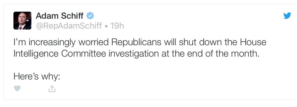 Schiff, who is working on the probe, said that Republicans on the committee have not issued any subpoenas or scheduled any further witness interviews past next Friday. The inaction, he added, comes at a time when the panel has made "important progress" in the nine months of the investigation, which has involved interviewing key witnesses and uncovering new leads.