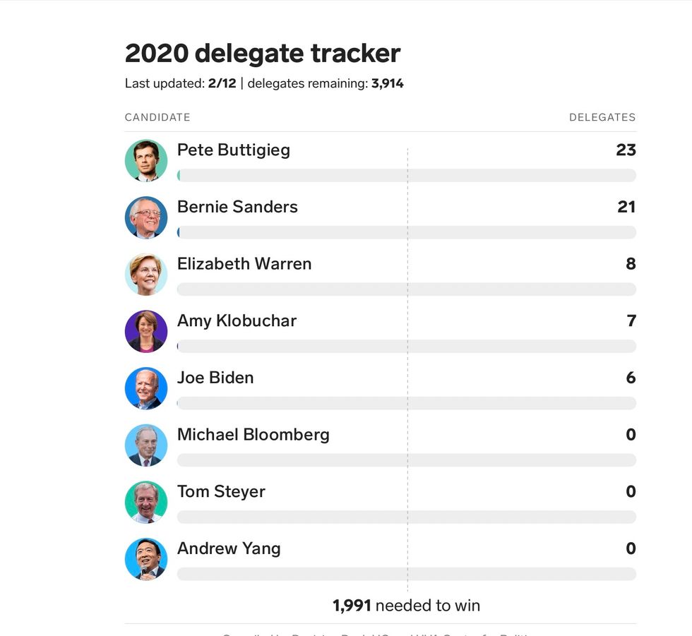 The delegate count each Democrats coming out of Iowa was 14 delegates to Buttigieg, 12 to Sanders and 1 to Klobuchar. Other Democrats with delegates earned in Iowa were Senator Elizabeth Warren 8 delegates, and former Vice President Joe Biden, 6.