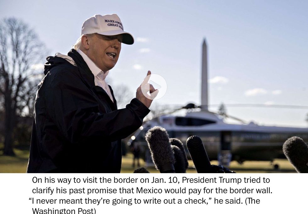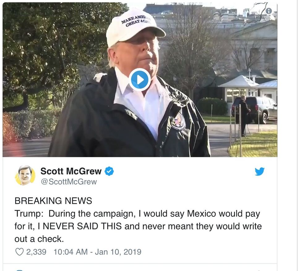 That is salient in the moment because of the ongoing government shutdown that stems from Trump's insistence that the American — not the Mexican — government would pick up the tab. He went further in comments to reporters on Thursday, claiming that his frequent assertions that Mexico would pay for the wall were always meant to suggest an indirect payment, just like the assertion above.