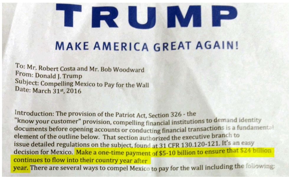 "I've always said we have to have a wall. I've also said Mexico's got to pay for it — sometimes you know on occasion, I'd add who's going to pay for it? Mexico. Well they will pay for it, OK?" Trump told the Wall Street Journal. "There are many forms of payment. I could name 10 right now. There are many forms of payment, I didn't say how."