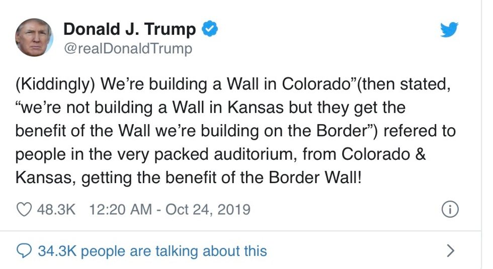 "We're building a wall on the border of New Mexico. And we're building a wall in Colorado. We're building a beautiful wall. A big one that really works. You can't get over you can't get under. And we're building a wall in Texas."