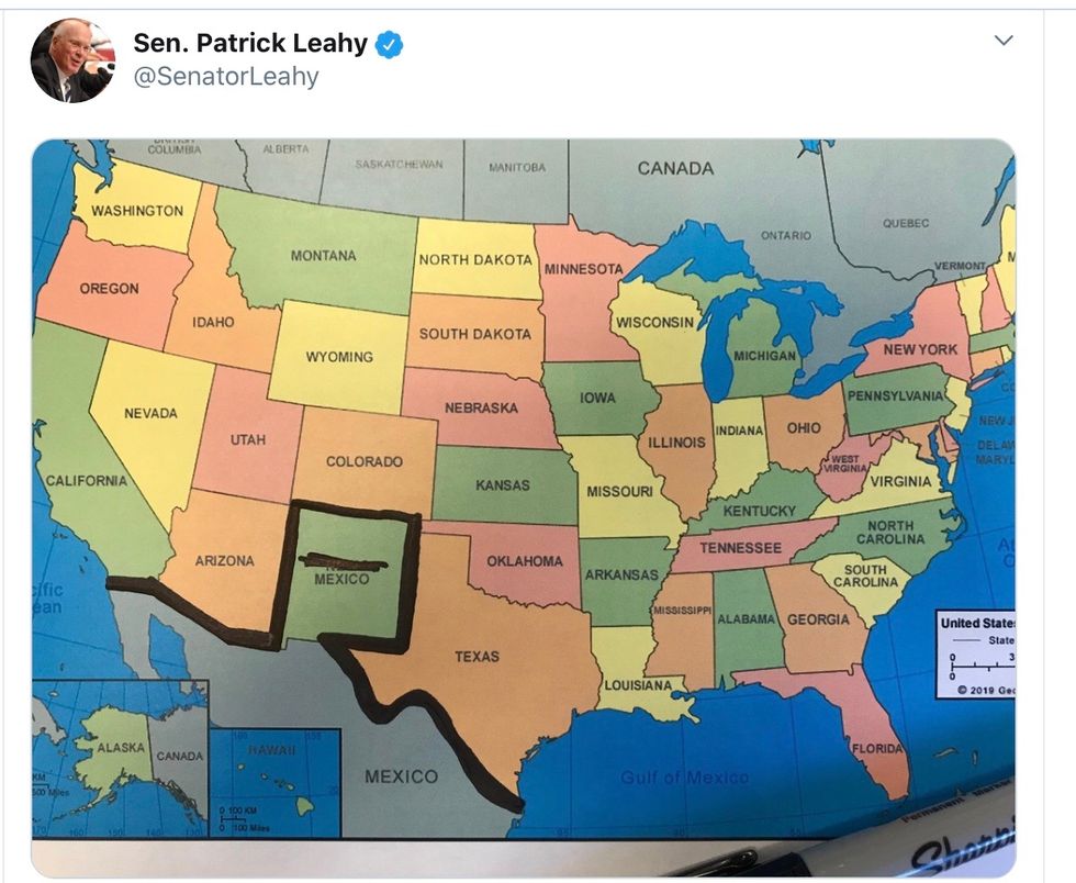 Senator Leahy (Dem, VT) assumes Trump's remark means Trump is giving back New Mexico to Mexico - then Colorado will be at the border. The good Senator used Trump's favorite tool, a sharpie, to show the Trump American map.