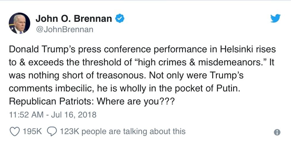 "Donald Trump's press conference performance in Helsinki rises to & exceeds the threshold of 'high crimes & misdemeanors.' It was nothing short of treasonous. Not only were Trump's comments imbecilic, he is wholly in the pocket of Putin. Republican Patriots: Where are you???"
