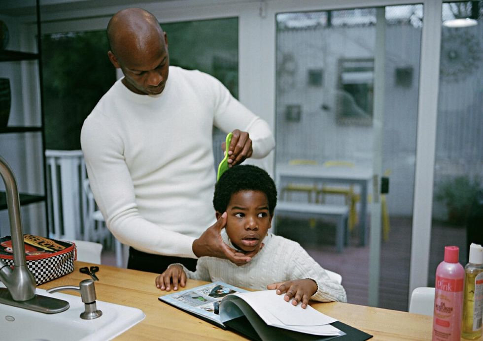 Dennis Williams, pictured here combing his son Élan's hair, said he was initially intimidated by becoming a single dad. But he gained confidence thanks to the support of his friends — one going so far as to donate her eggs.Credit...Bart Heynen