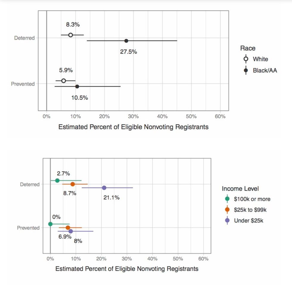 The study also found socioeconomic and racial disparities among those impacted by the new law. "The burdens of voter ID fell disproportionately on low-income and minority populations," writes Mayer. More than 20 percent of registrants coming from homes with incomes less than $25,000 say they were kept from voting by the law; 8.3 percent of white voters surveyed were deterred, compared with 27.5 percent of African Americans.