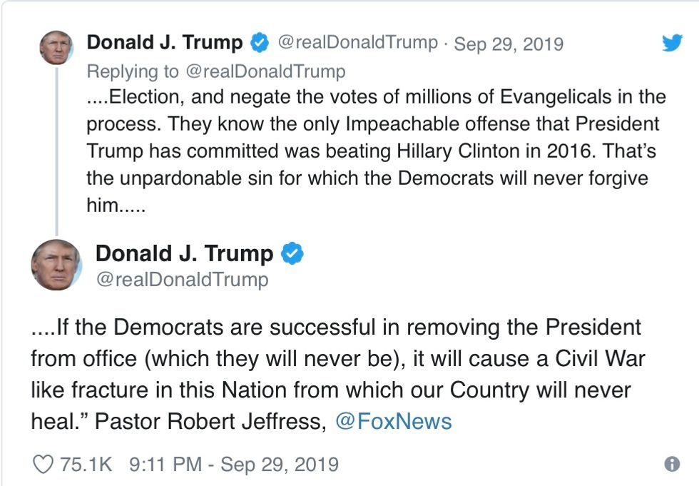 His white evangelical boosters are a big part of this base, with Texas Baptist pastor Robert Jeffress warning of "Civil War-like" division if impeachment proceeds and fellow evangelist Franklin Graham calling the faithful to prayer on Trump's behalf. Last week at the White House, Trump celebrated that some of the "biggest pastors"had called to tell him how "electrified" their congregations are to stand with him.