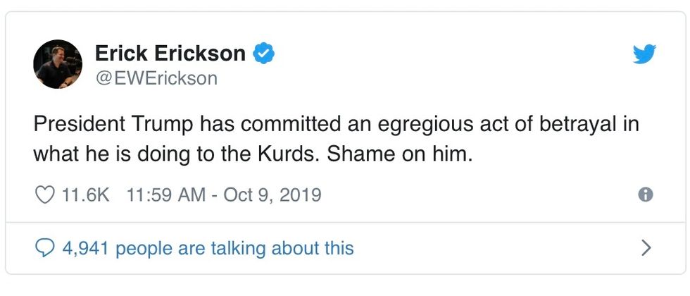 As Turkey began its assault on Wednesday, religious conservatives who have consistently rallied to defend Trump called on their followers to pray for victims of the massacre Trump has facilitated. "President Trump has committed an egregious act of betrayal," conservative Christian radio host Erick Erickson tweeted. David Brody, the CBN reporter who published a hagiography of Trump last year, retweeted Erickson's assessment. While the caging of immigrants from Central America and the ban on travelers from several Muslim countries did little to shake Trump's support among this group, this betrayal of American allies in a part of the world where white Christians understand the church to be a persecuted minority has sparked defiance in the Trumpvangelical camp.