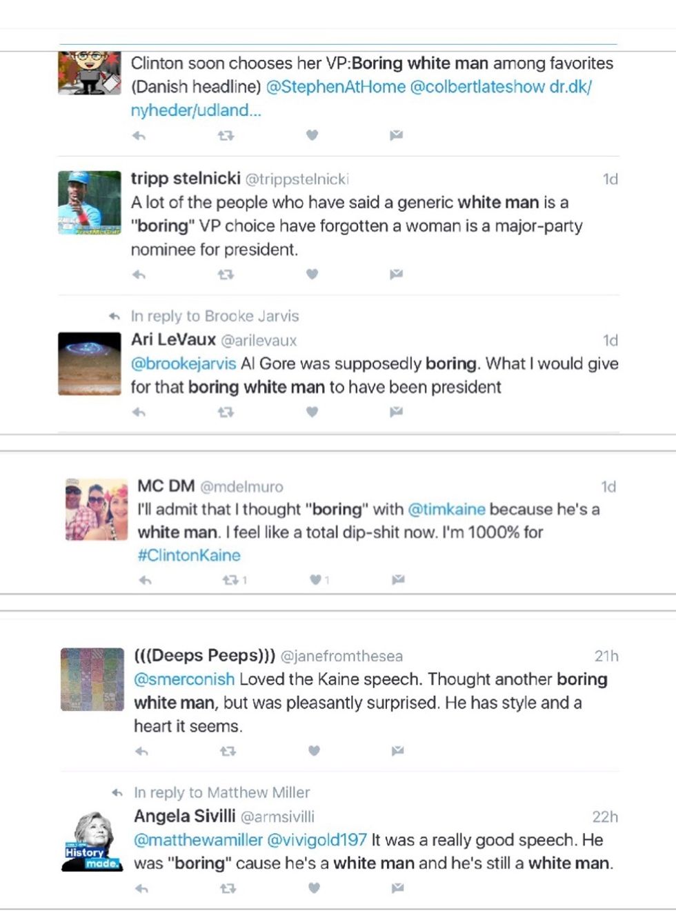Let's be clear: Kaine was not a political choice: he does not deliver a state. (Virginia was looking good for Hillary before he was announced, if not sewed up ) or excite a particular ideological wing. In fact, the number of twitterati who expressed disappointment that he was "another boring white man " showed the extent of cultural change. That's something to recognize and cheer - if not the only reason to decide.