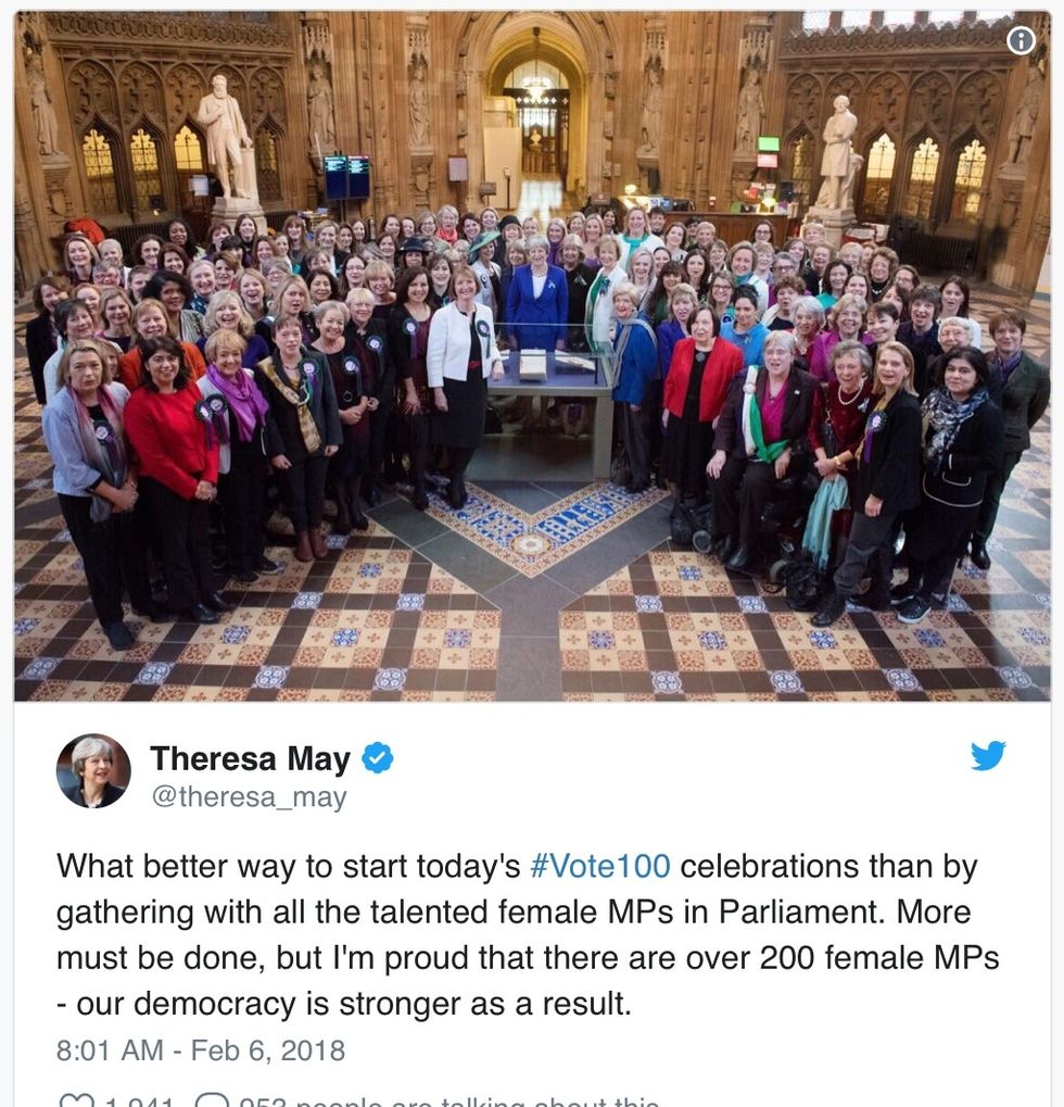 Mrs. May also appeared in Parliament for a photograph with all of its more than 200 female members.