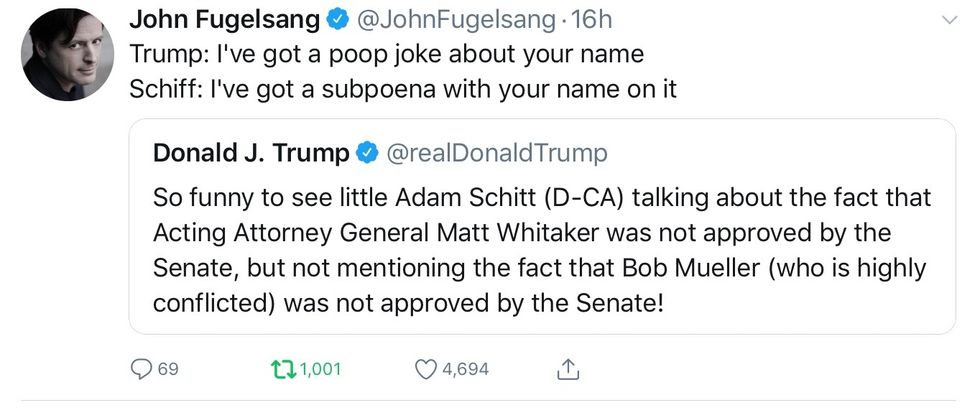 Here are other responses, recorded by The New York Times, including Representative Schiff's reply. https://www.nytimes.com/2018/11/18/us/politics/trump-schiff-tweet.html