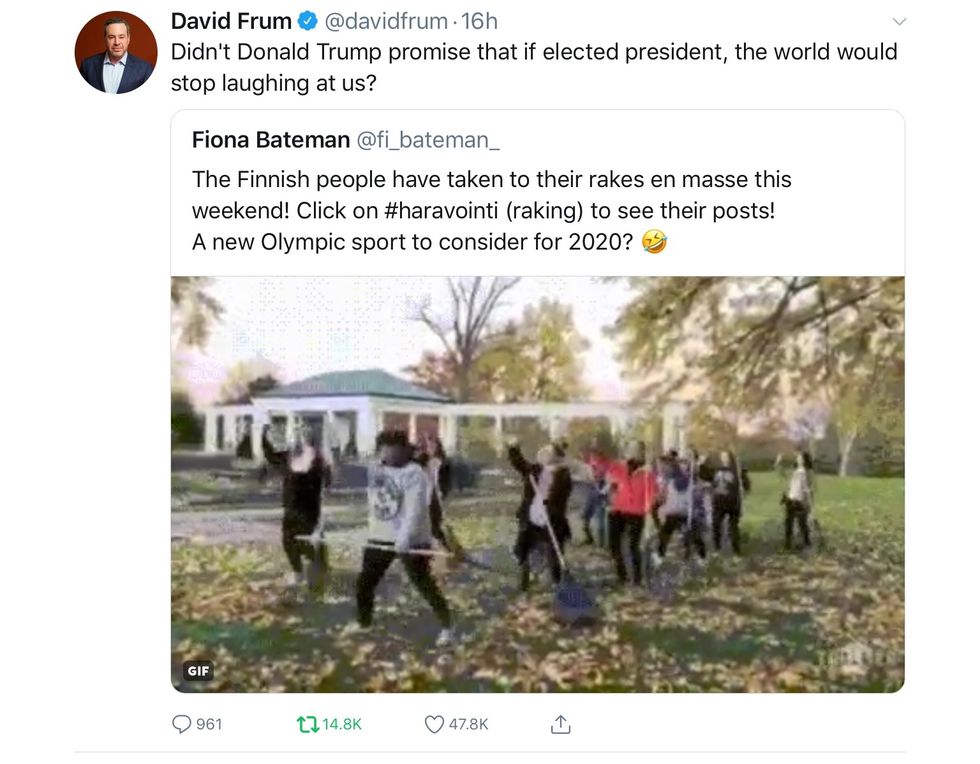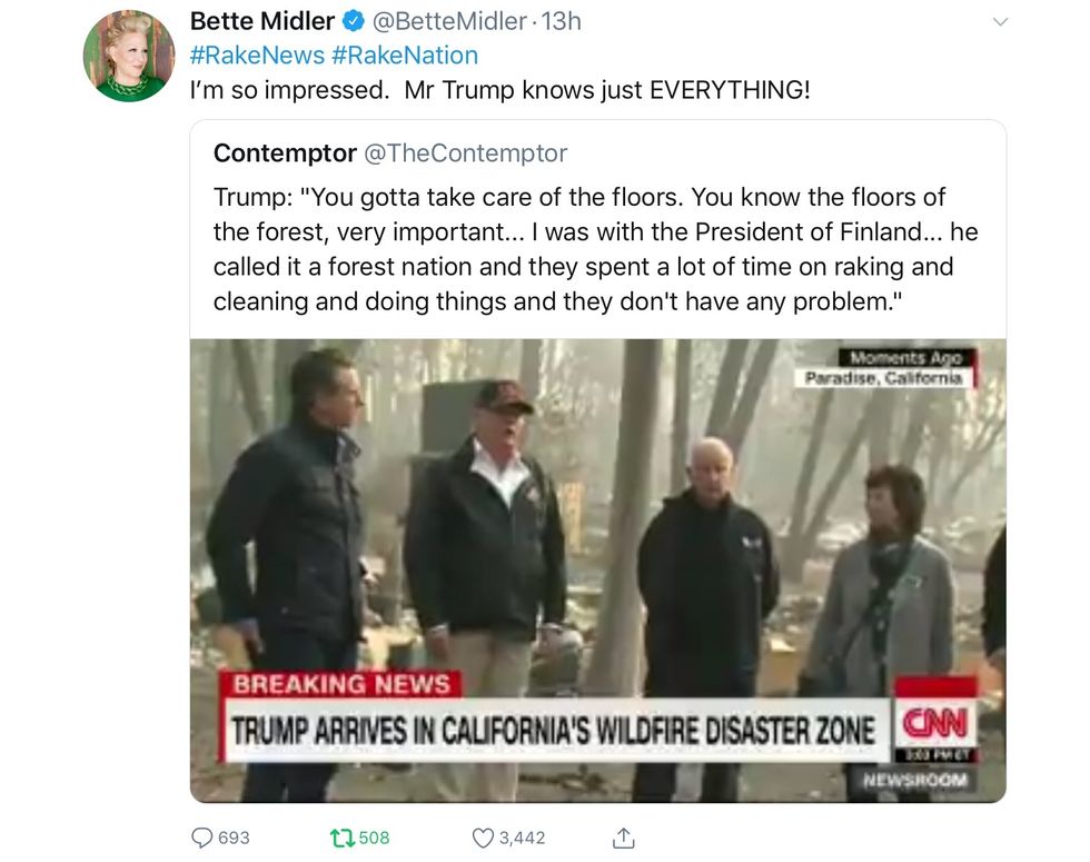 On another matter, the crisis of the California fires and the consequential smoke and pollution they cause, the absence of a real president continues to alarm, though being Americans, we find humor in even this. Here are two appropriate responses to the inappropriateness and ignorance of the man who occupies the White House where a real president and leader should be.