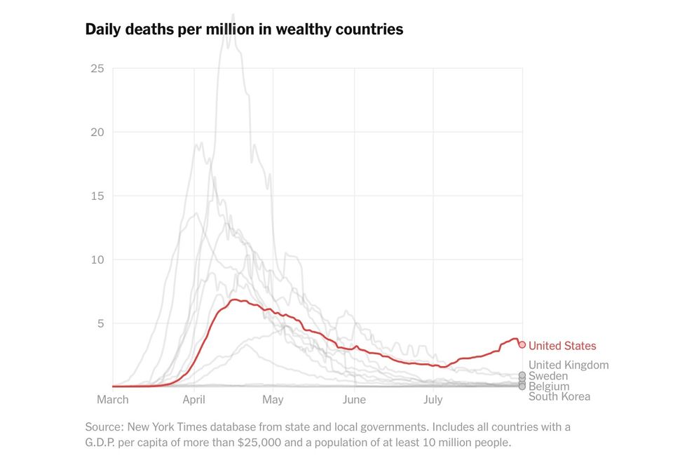 Yet even with all of these problems, one country stands alone, as the only affluent nation to have suffered a severe, sustained outbreak for more than four months: the United States.