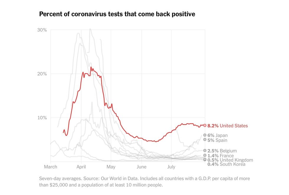 One measure of the continuing troubles with testing is the percentage of tests that come back positive. In a country that has the virus under control, fewer than 5 percent of tests come back positive, according to World Health Organization guidelines. Many countries have reached that benchmark. The United States, even with the large recent volume of tests, has not.