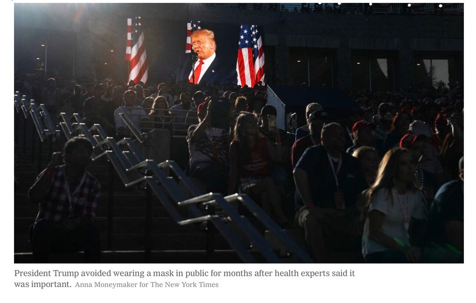 Mr. Trump avoided wearing one in public for months. He poked fun at a reporter who wore one to a news conference, asking the reporter to take it off and saying that wearing one was "politically correct." He described former Vice President Joseph R. Biden Jr.'s decision to wear one outdoors as "very unusual."