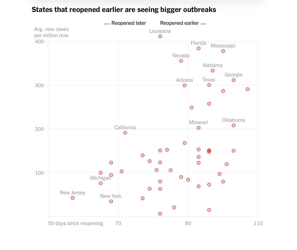 In the weeks after states reopened, the virus began surging. Those that opened earliest tended to have worse outbreaks, according to a Times analysis. The Southeast fared especially badly.