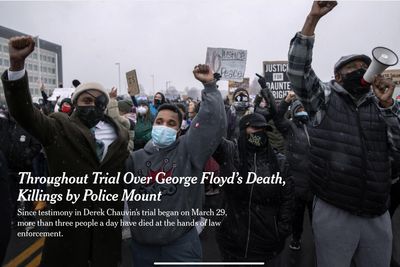 Since testimony began on March 29, at least 64 people have died at the hands of law enforcement nationwide, with Black and Latino people representing more than half of the dead. As of Saturday, the average was more than three killings a day.