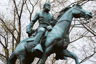 A statue of Confederate General Thomas "Stonewall" Jackson is seen on April 1, 2021 in Charlottesville, Virginia. The Charlottesville City Council voted June 7 to remove the the statues following a court battle of more than three years.