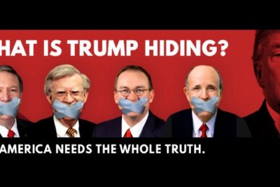The ads show an image of President Trump behind Secretary of State Mike Pompeo, former National Security adviser John Bolton, acting White House Chief of Staff Mick Mulvaney and President Trump's personal attorney Rudy Giuliani with tape over all of their mouths, according to copies of the billboards shared with The Hill.
