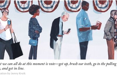 What we can all do at this moment is vote—get up, brush our teeth, go to the polling place, and get in line. I was never in combat as a soldier, but now I am. Those of you who haven't quite been getting to your polling place lately, who want better candidates or a clearer system of making yourself heard, or who just aren't in the habit, need to get it done this time around. If you stay home, count yourself among the hundreds of thousands now being disenfranchised by the relentless parade of restrictions that Republicans everywhere are imposing and enforcing. If you don't vote, they have won, and you are a captive, one of their prizes.