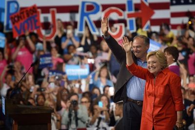 Tim Kaine spoke next and had the crowd roaring "No" when he repeatedly asked if they believed Trump.