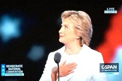 So she nails the speech. She looks great in that white suit. She turns everyone's anxiety into real hope—we don't have to go down that terrible Trumpian road to a catastrophic future. She's going to win this, and fix the whole planet, and we're going to do it together. She has the whole place chanting her name.