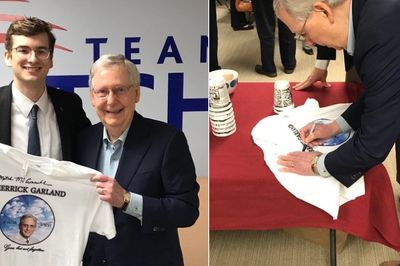 The Senate majority leader, who effectively blocked former President Obama's 2016 nomination of Garland, can be seen in the photos holding a shirt that reads McConnell's name above Garland's.