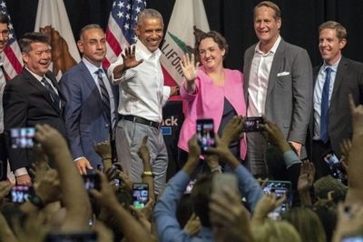 Joining Obama on stage at the end of his remarks were six Democrats running to replace House Republicans from California. Voters in all of their districts favored Hillary Clinton over Trump in 2016.