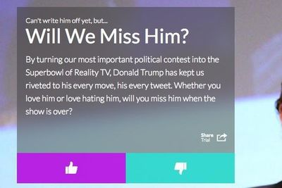 "Sorry Mr. Trump! Despite your constant presence in the media, 75% of the voters in this Rule of Thumb Trial won't miss your incendiary bloviating should you fail to be elected President and begin to wither in the public eye. Why? Well, it seems the presence you have created is sort of like a soiled baby diaper on a family car trip. Oh yeah, it gets our attention, but for all the wrong reasons. And as you can see by the vote count and the comments in this Rule of Thumb Trial, many will be happy when your scent starts to dissipate."