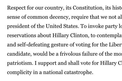 HE EXPLAINS NOT JUST WHY HE IS NOT VOTING FOR TRUMP, BUT WHY HE IS VOTING FOR HILLARY. THIS IS A BINARY CHOICE, AN EXISTENTIAL CHOICE TO PROTECT OUR WAY OF LIFE.