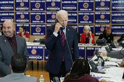 President Joe Biden on Friday traveled to Boston to visit the International Brotherhood of Electrical Workers, where he participated in a phone bank for incumbent Democrat Sen. Raphael Warnock, who is running to keep his seat representing Georgia in the next Congress – a state notably further south than Biden's stop in Massachusetts.