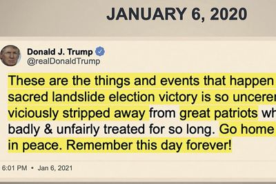 Trump's voice rang out in the Senate Chamber as Democrats aired video from his rallies and other remarks to supporters. Interspersed throughout were slides of Trump's tweets contesting the election and promoting the Jan. 6 rally in Washington, which he promised would be "wild."