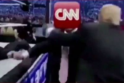 If you don't recognize it, that's a clip from Wrestlemania 2007 (sources say) where Trump is unleashing on Vince McMahon, but it's been edited to show him pummeling CNN. Trump is a violent and crazy man threatening the media.