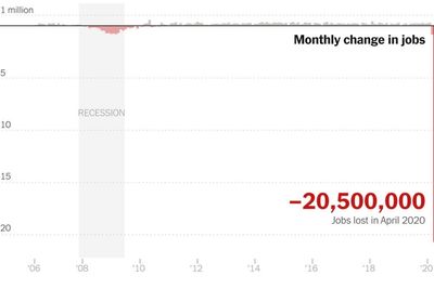 The April job losses alone far exceed the 8.7 million in the last recession, when unemployment peaked at 10 percent in October 2009. The only comparable period came when the rate reached about 25 percent in 1933, before the government began publishing official statistics.