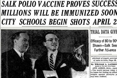 The federal government licensed the vaccine within hours of the announcement and manufacturers began their production efforts. "An historic victory over a dread disease," a newscaster's voice declared in an April 12 reel from Metro-Goldwyn-Mayer. The announcement includes clips of men in suits rolling carts of vaccine shipments, much like this month's images of coronavirus vaccine shipments. "Here scientists usher in a new medical age."