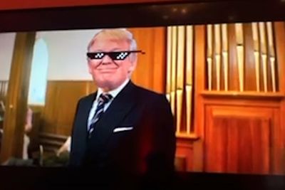 The setting for the massacre is the "Church of Fake News," capturing Trump's familiar refrain about news stories and organizations that he considers to be fake news.