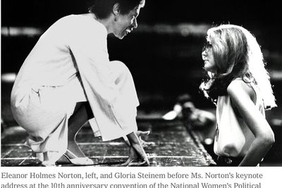 In perhaps my favorite image from The New York Times photo archive — an elegant profile — Eleanor Holmes Norton is kneeling on a stage, with Gloria Steinem standing at her feet. It was the 10th anniversary of the National Women's Political Caucus, and Eleanor, a co-founder of the caucus, was set to deliver the keynote address. She's dressed in white, with sling-back heels, and wears her hair in a short-cropped Afro. Her mouth is slightly ajar, because she is talking. Gloria's mouth draws lip to lip, closed, because she is listening. She has always listened to black women. I know because it is evidenced in the photographs — which are templates of integrity — but also because she has always listened to me.