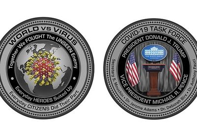 One coin has an image of a COVID-19 spore superimposed on a world map, while a second coin features an empty White House podium with the names of the coronavirus task force members surrounding it including President Trump, Vice President Pence, Treasury Secretary Steve Mnuchin and medical experts Drs. Deborah Birx and Anthony Fauci.