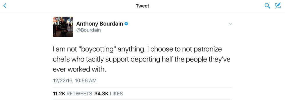 "I am not 'boycotting' anything," Bourdain wrote. "I choose to not patronize chefs who tacitly support deporting half the people they've ever worked with."