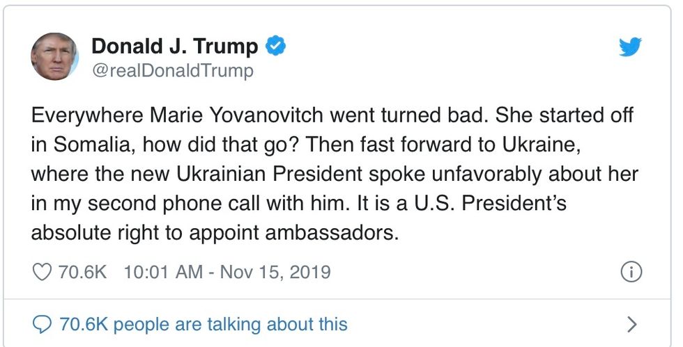"Everywhere Marie Yovanovitch went turned bad," he wrote on Twitter. "She started off in Somalia, how did that go? Then fast forward to Ukraine, where the new Ukrainian President spoke unfavorably about her in my second phone call with him. It is a U.S. President's absolute right to appoint ambassadors."