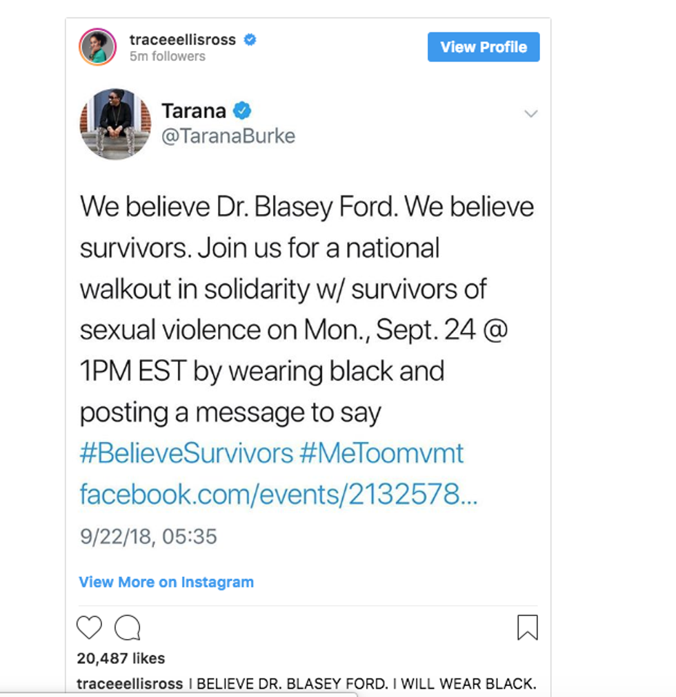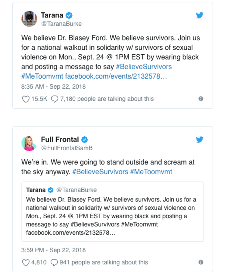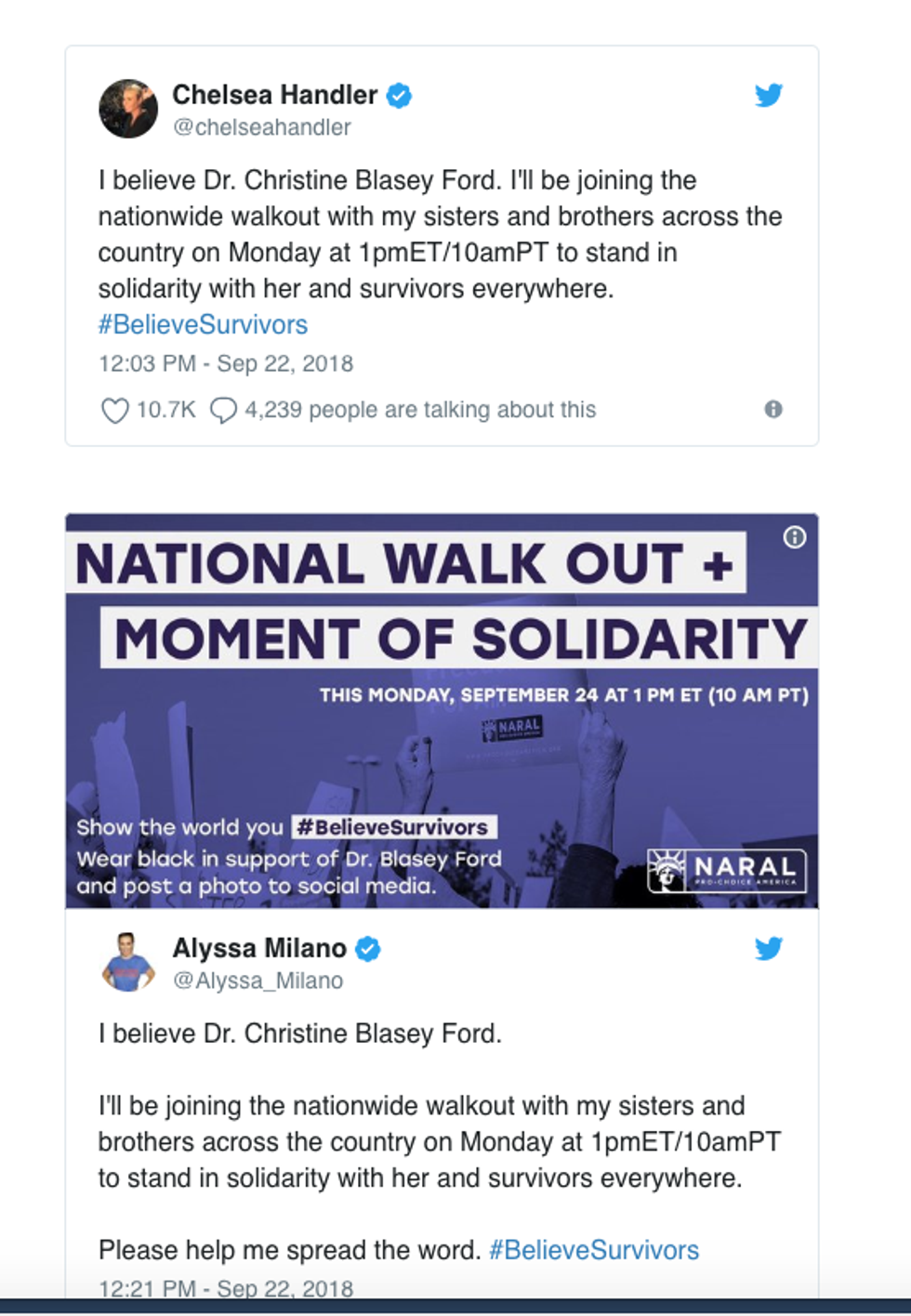 5:51 AM - 22 Sep 2018 We believe Dr. Christie Blasey Ford & we stand with her. Kavanaugh should be disqualified from the Supreme Court—& the GOP must stop bullying her. Join us in solidarity by wearing black & walking out of work/school/home on Monday at 1 pm ET + posting a photo w/ #BelieveSurvivors.Those walking out will be wearing black.