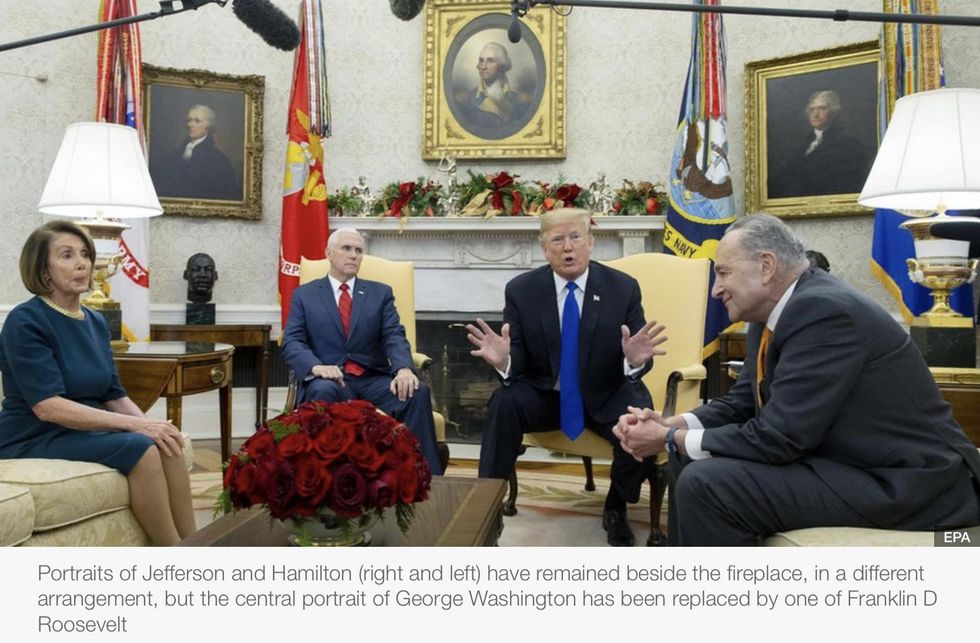 Gone on Wednesday were the gold curtains and rug that Mr Trump brought in when he assumed office in 2017. They had been replaced by a dark blue rug and darker gold curtains that adorned the Oval office when President Bill Clinton was in power, the Post reports.Flags of the different branches of the military have also been replaced with an American flag and another with a presidential seal.A controversial bust of Britain's wartime leader Sir Winston Churchill has also gone. President Trump had promised to restore the bust to the Oval Office after it was removed by his predecessor Barack Obama. The then foreign secretary Boris Johnson - now UK prime minister - had at the time accused Mr Obama of having an "ancestral dislike of the British empire". This time, his spokesman, said: "The Oval office is the president's private office and it's up to the president to decorate it as he wishes".