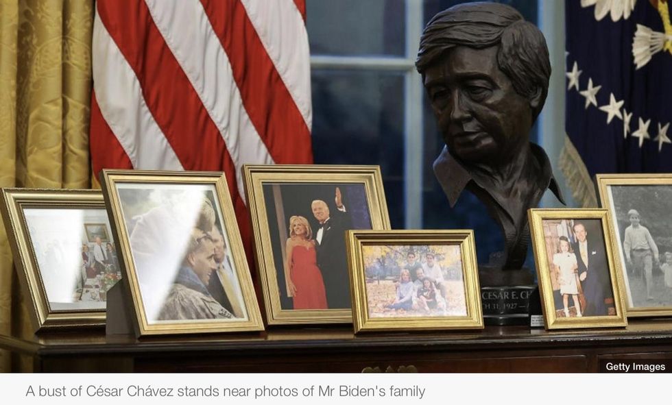 Many on social media noted, on the table behind Mr Biden, a bust of César Chávez, the Mexican-American labour leader who fought for the rights of farm workers in the 1960s and 70s. His bust sits alongside framed photos of Mr Biden's family.