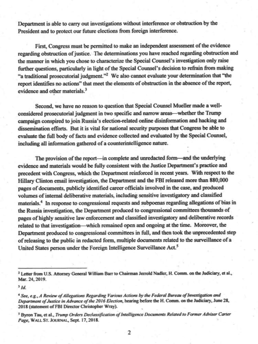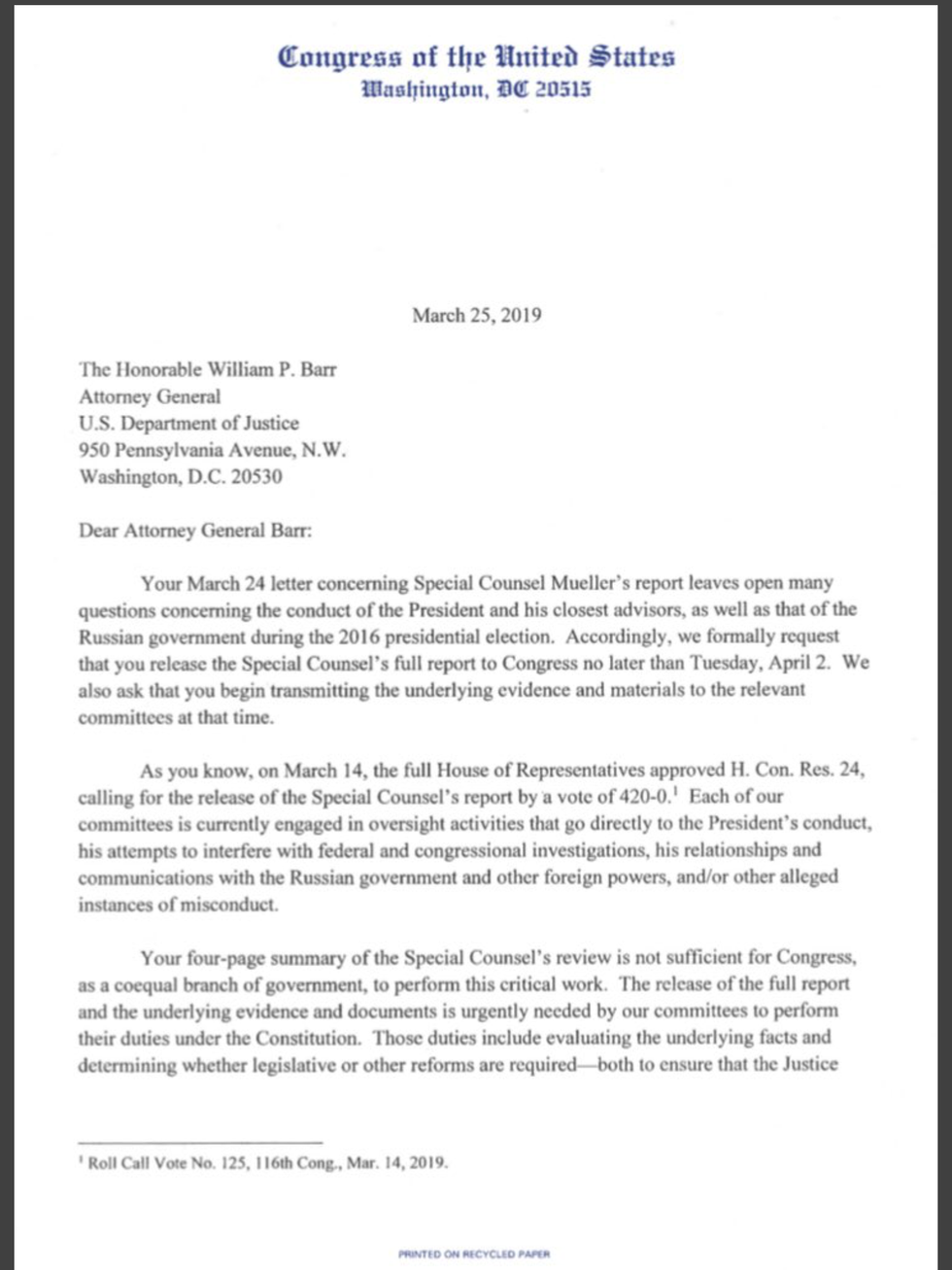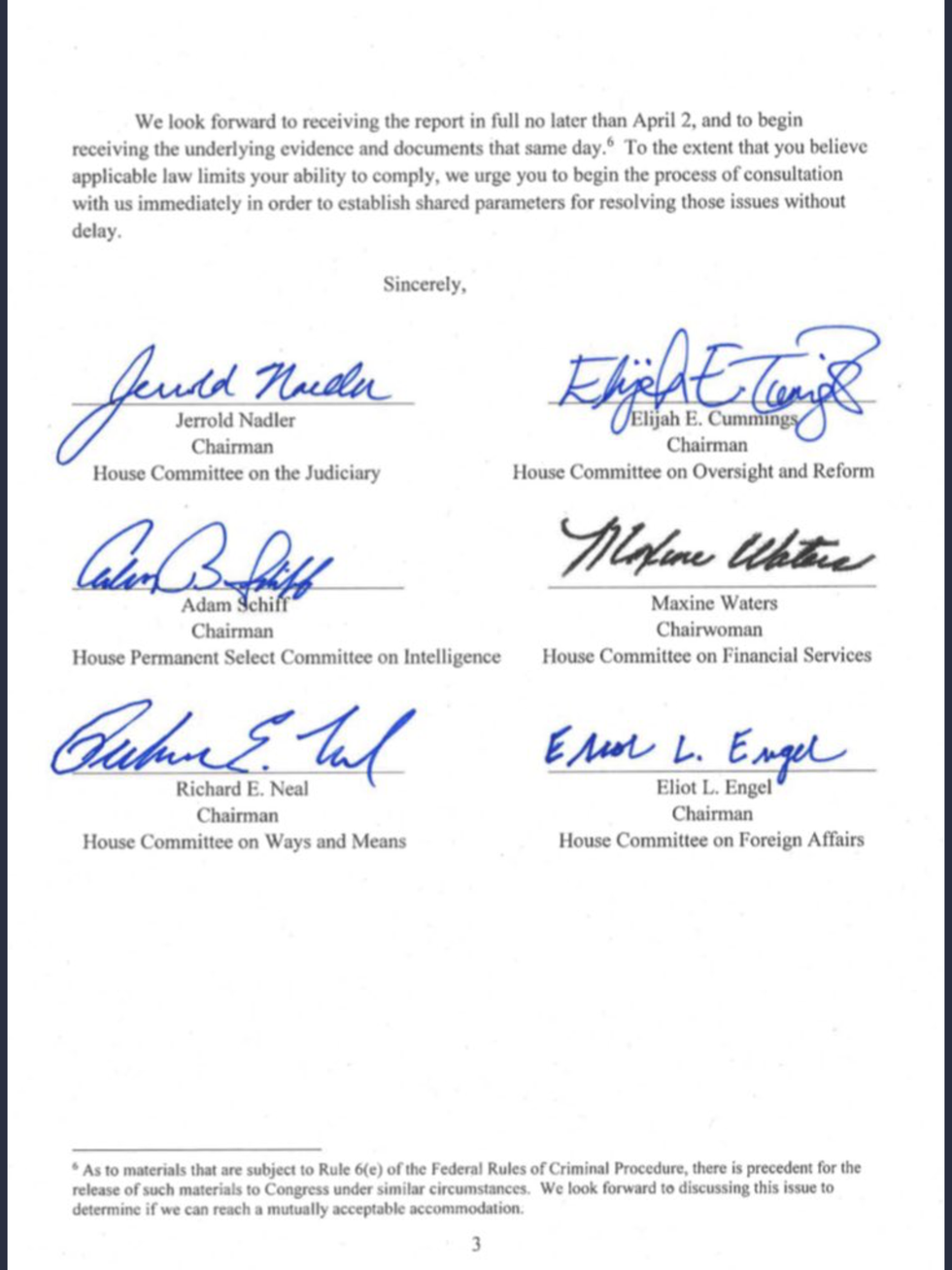 6 Chairs of Congrssional Committees -Nadler, Cummings, Schiff, Waters, Neal and Engel - have now written to Barr asking for the full report by Tuesday, April 2. Stay tuned.