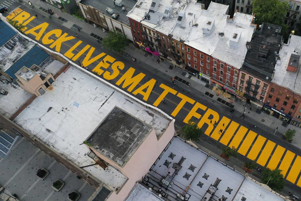 Another mural with bold yellow letters was painted this month by artists and volunteers on a street in Brooklyn's Bedford-Stuyvesant neighborhood.