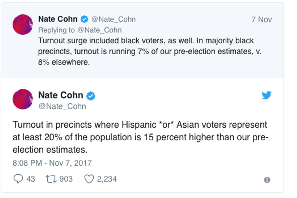 Yes, Northam carried 42 percent of the white vote, higher than Hillary in 2016 (35 percent), Mark Warner in 2014 (37 percent), Terry McAuliffe in 2013 (36 percent), and Barack Obama in either 2008 (39 percent) or 2012 (37 percent). But without the higher turnout from Black Voters, what happened in Virginia would not have happened.