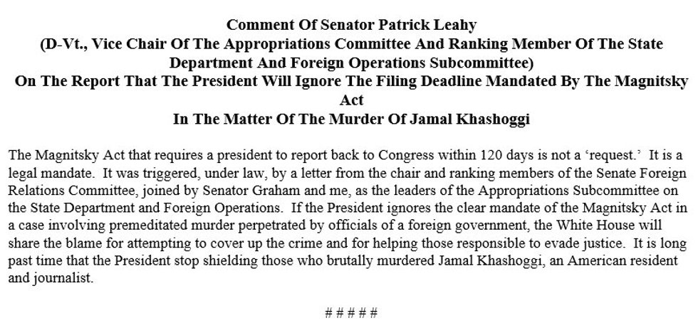BREAKING: Leahy REAX On Report That The President Will Ignore Filing Deadline For Magnitsky Act Report On The Murder Of Jamal #Khashoggi @washingtonpost https://t.co/DYU9FmR46X https://t.co/ghFOFagFW6